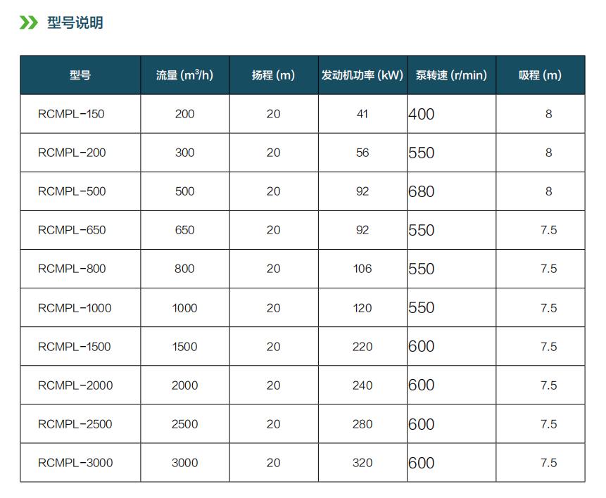 RCMPL 系列拖车式柴油机凸轮泵车是在反复研究国内外同类技术的基础上开发成功的一种结构新颖的产品。该泵是 一种正排量自吸式旋转活塞泵,其工作原理如下:当动力带动传动轴传递扭矩时,主动轴驱动齿轮箱内的一对同步 齿轮及固定在泵轴上的二个转子做相对运动,使泵吸入端产生真空,排出端形成负载压力,来达到输送液体介质的 目的。泵连续转动时,在转子的相对作用下,泵轴每转动一转便由六次满载的液体介质排出。动力机的转向决定了 泵输送介质的方向,无正反转之分,在规定的转速范围内泵的流量大小与泵的转速成正比。可广泛适用于市政排污 及防涝工程、农业灌溉等。该泵组具有结构简单、自吸性能好、排污能力强、高效节能、使用维修方便。配用多功 能移动拖车。