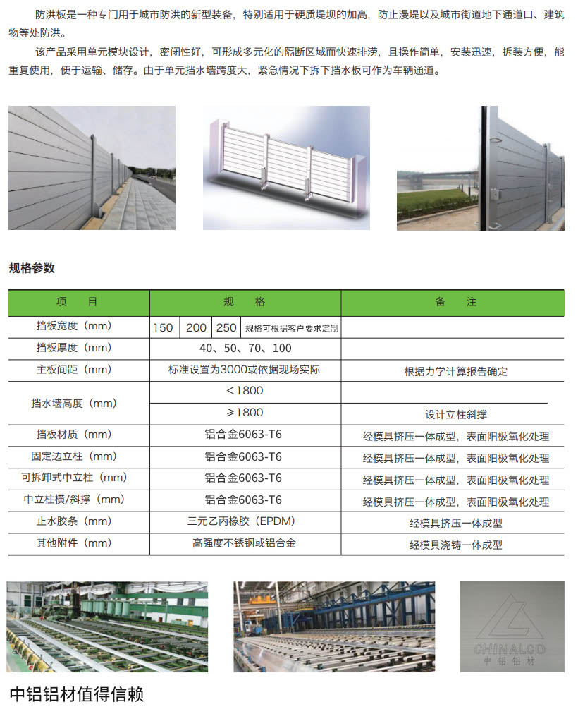 防洪板是- -种专门用于城市防洪的新型装备,特别适用于硬质堤坝的加高,防止漫堤以及城市街道地下通道口、建筑物等处防洪。