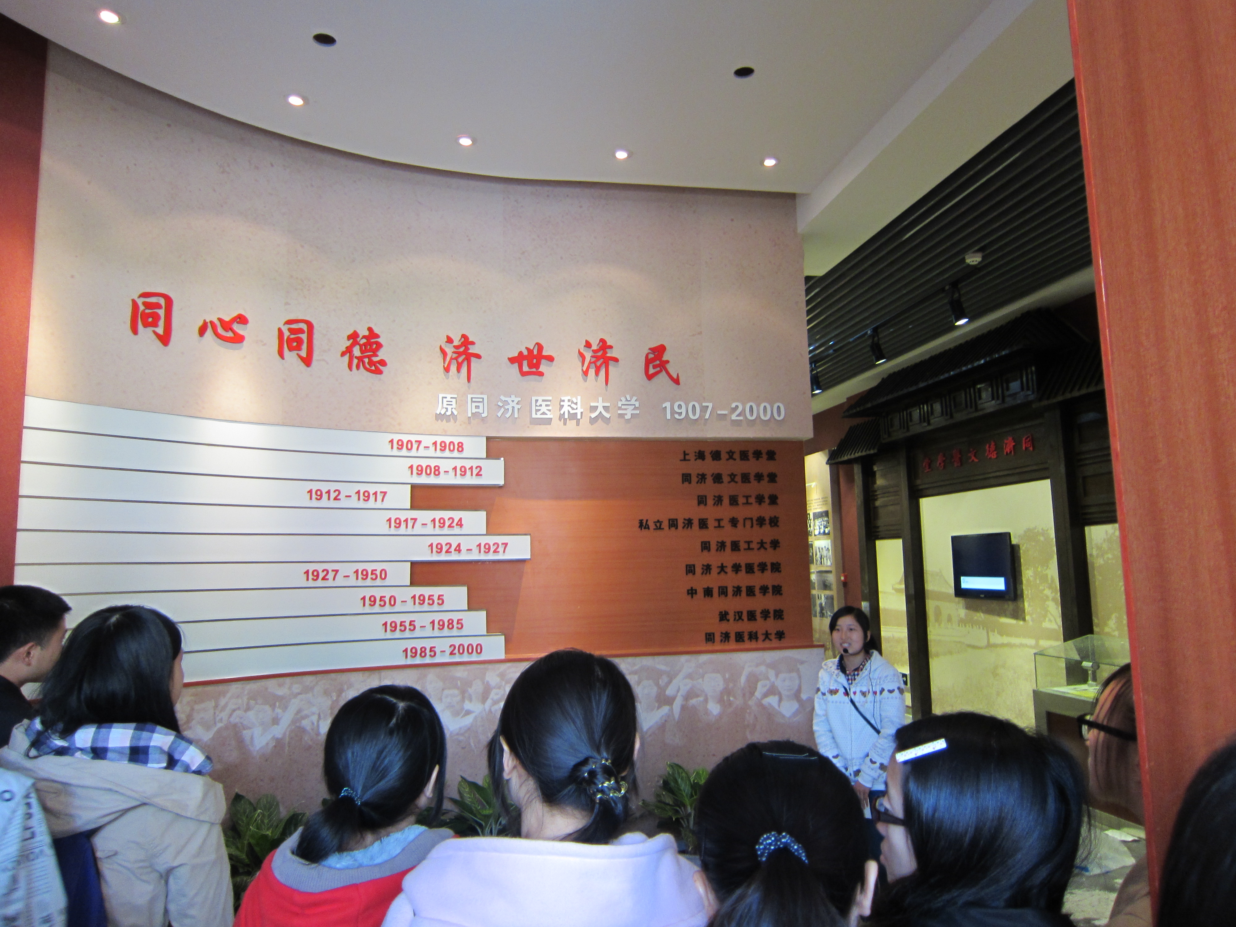 观看完视频介绍后大家就正式进入到馆内参观。首先是在解说员的带领下进入到同济馆。墙上的年份清晰的展示了同济医学院在不同时期的不同称呼,尽管同济医学院在不同时期改了不同的名字,但是它所坚持的同舟共济的医学理念却一直被坚持被秉承着,未曾改变过。解说员详细地给大家讲述了同济医学院从创建之初发展到现在的历程,这让我们对原本不是很了解的同济医学院有了一个明确的概念。