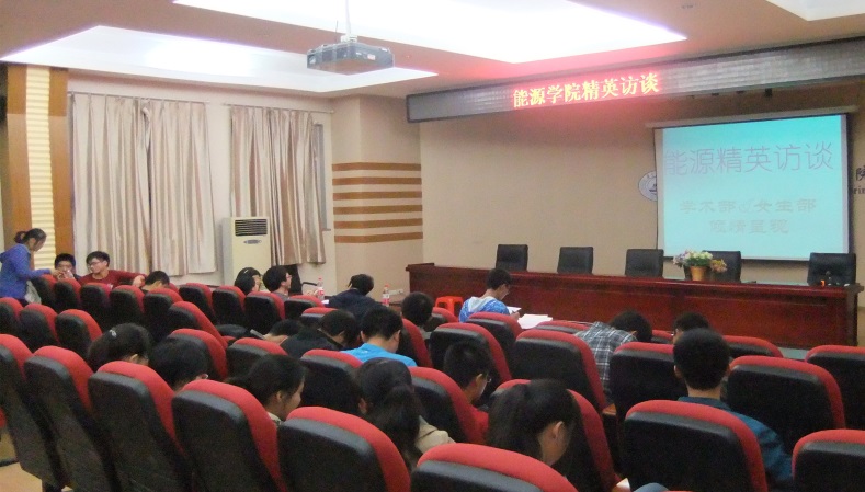 2013年10月21日晚7点能源学院团学联举办的“精英访谈”活动在能源学院动力楼402会议室拉开帷幕,本次访谈特邀请5位优秀的高年级同学向低年级同学分享了自己的大学经历、感悟,以及应如何度过自己的大学时光。
