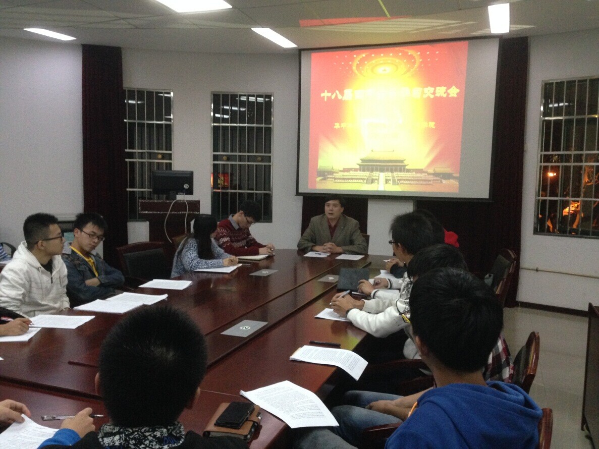 会议伊始,在冯晓东老师的带领下,首先对十八届四中全会公报全文进行了学习。紧接着冯晓东围绕“学习贯彻十八届四中全会精神,如何全面推进依法治国,法治中国;青年大学生如何落实中央相关文件精神,以依法治国实现伟大中国梦;在校大学生如何将提高法律意识和严格遵守校规校纪相结合。”等方面给我们做了深入的讲解和剖析。