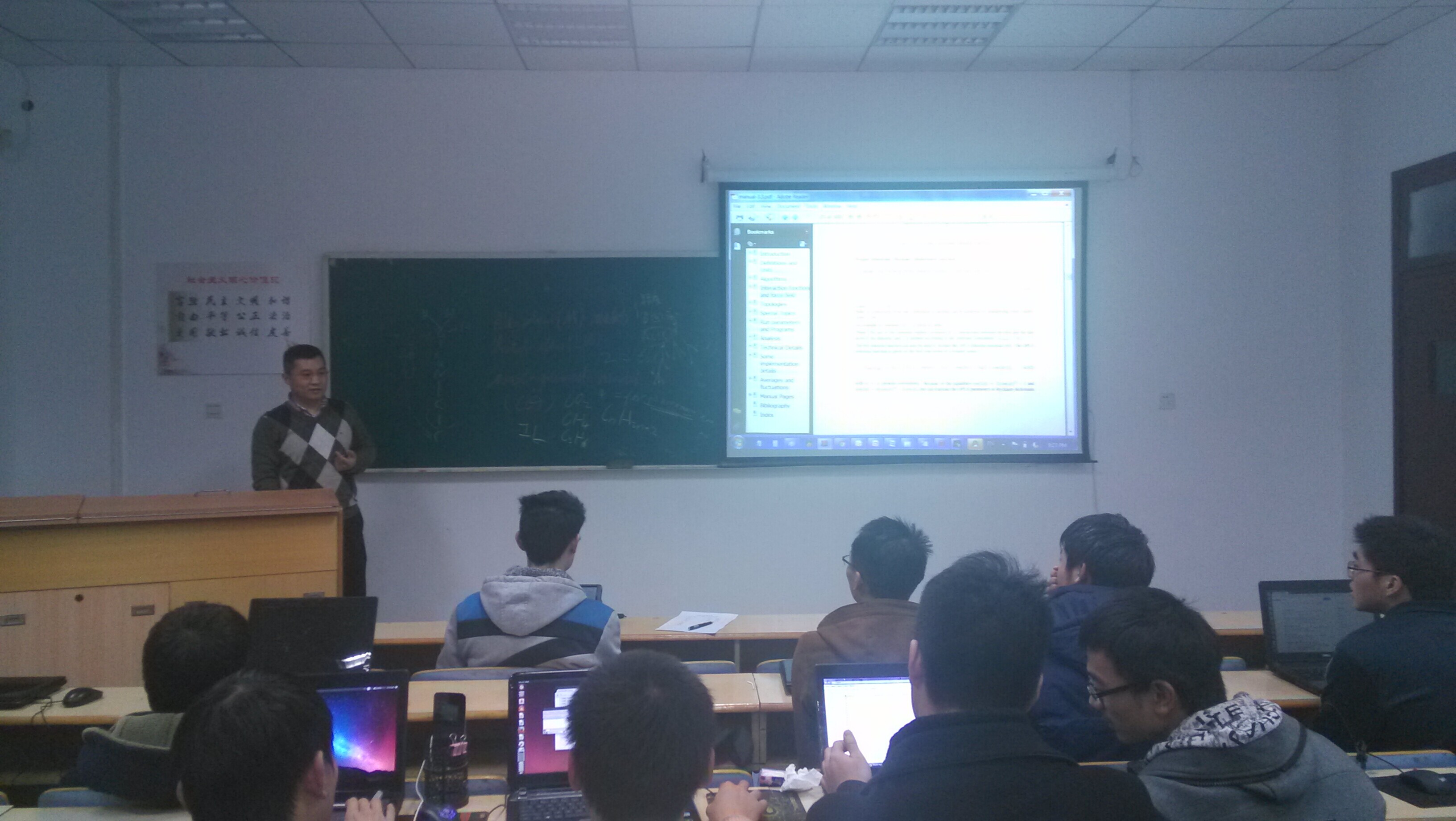 2014年12月27日星期六晚7点半,西五楼405教室里一改往日自习的安静,传来阵阵循循善诱的讲课声。这里正在进行的是煤燃烧国家重点实验室冯光教授为科创训练营30多位同学讲授的第一次分子动力学软件实验指导课。在此之前,经过将近两个月的理论学习,同学们已经在杨诺和冯光教授的带领下学习了分子动力学理论知识,并且从老师们那里学到了很多关于学习和人生的道理。