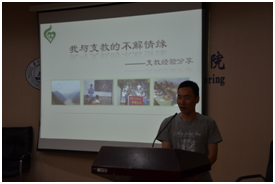 随后,三支优秀队伍的代表分别与同学们分享了他们在社会实践活动中的宝贵经验。来自能源学院的赴杭州“新能源新动力新未来”队的队员王云鹏同学介绍了如何选择与本专业相关的主题以及如何联系相关企业;来自化院的赴四川凉山爱心支教“晨曦之光”队队长孙健康同学则从支教过程中遇到的小事入手,与同学们分享了支教过程中的苦与乐;来自自动化学院的赴江西瑞金社会调查队队员许建同学,通过活动成果展示,向同学们传授了许多暑期社会实践过程中的小技巧。他们丰富的实践经历、幽默的语言、贴心的建议激发了同学们对暑期社会实践活动的兴趣的同时也有了更具体的感官认识。