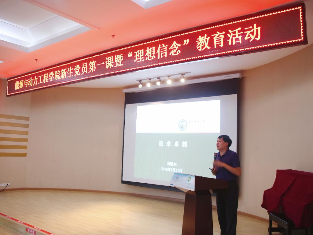 为进一步深入学习贯彻习近平新时代中国特色社会主义思想,践行社会主义核心价值观,强化研究生新生的使命感、责任感,发挥党员的先锋模范作用,能源学院9月27日早8:00在动力楼402会议室召开了2018级新生党员第一课暨“理想信念”教育活动,会议邀请到了学院党委副书记冯晓东老师作为主讲嘉宾,2018级全体研究生、博士生新生党员参与了本次党课。