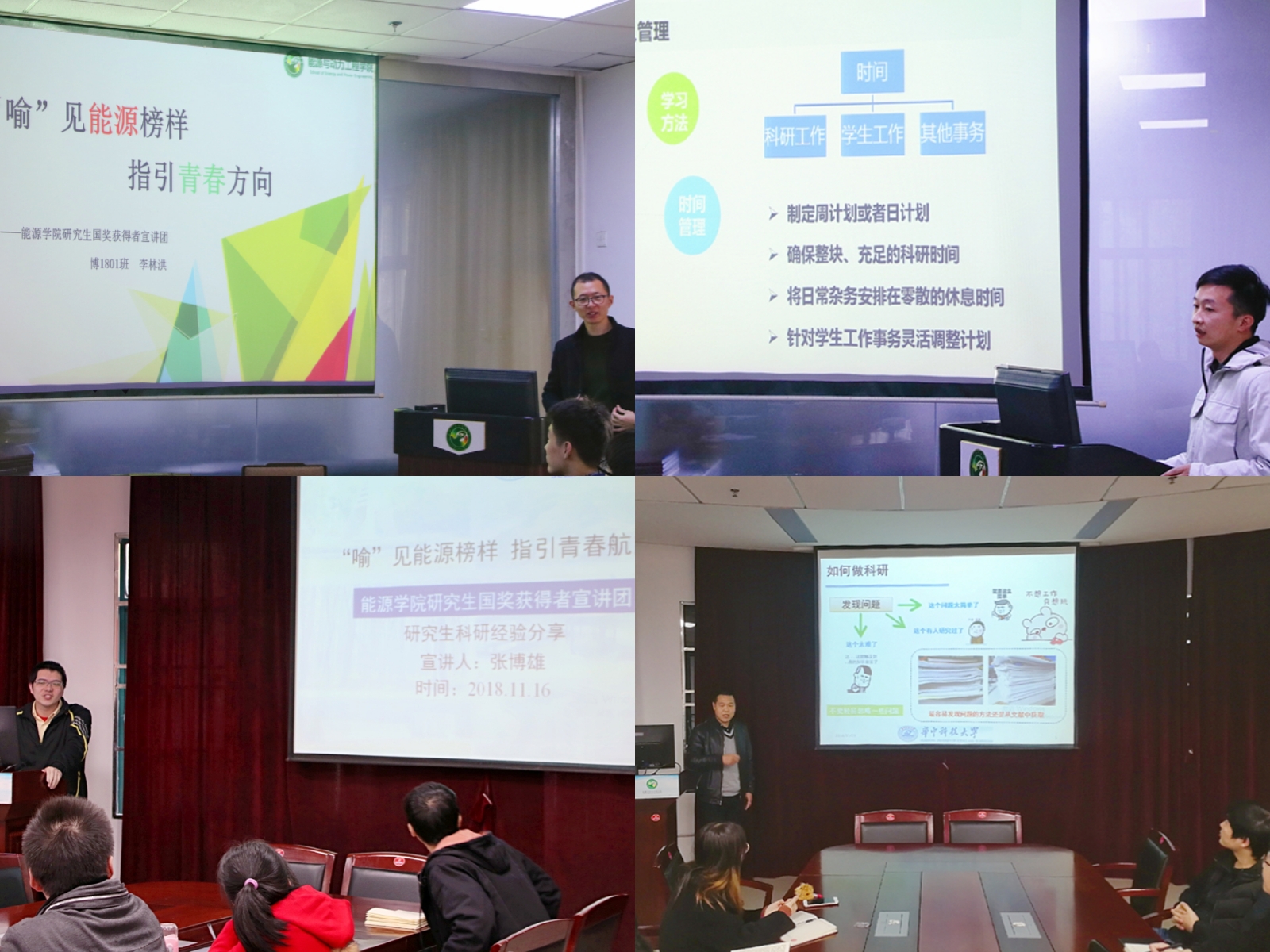 (通讯员:韩阳 孙铭跃)为深入贯彻学习党的十九大精神和我校第四次党代会精神,让“学在华中大”的品牌更加响亮,引导带动广大华中大学子向上向善、追求卓越,能源学院于2018年11月邀请荣获本年度国家奖学金的11位同学组成宣讲团,在硕博24个支部的组织生活会上,分享他们关于学习、科研、时间管理、学生工作等方面的独特见解。