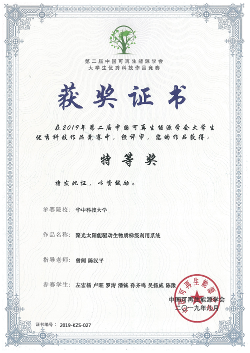 本次竞赛于今年5月启动,以“同创清洁能源、共享绿水青山”为主题,共收到来自全国100多所高校共计600余件作品,经过团队申报、校级初评、资格审查和专家评审等环节,本次总决赛共有来自58所高校的108件优秀作品进入决赛。yl23411永利集团团队共有5支参赛队伍进入决赛,经过一天的作品展示、现场答辩与评审,最终2016级本科生左宏杨带领的小组凭借作品“聚光太阳能驱动生物质梯级利用系统”获得本次竞赛特等奖(全国共4件)。该项目结合聚光太阳能储热系统换热流体热力循环过程中温度连续下降的特点与生物质高温热解、中低温热解、烘焙温度呈梯度分布的特点,以间接梯级烘焙/热解的创新构思结合储热技术着重解决聚光太阳能的瞬时性与间断性对生物质利用系统的不利影响,在曾阔老师和陈汉平老师的指导下,最终完成了这一新系统的设计,并在项目开展过程中申请3项发明专利。