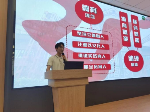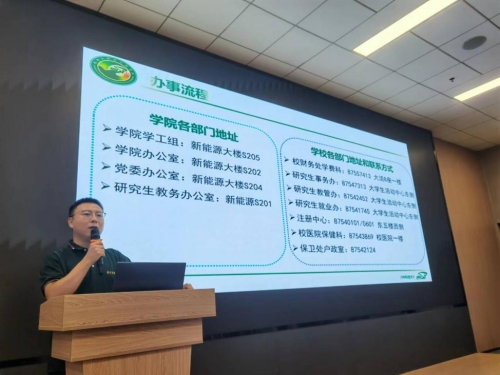 能源学院研究生辅导员李成璞对研究生新生信息、学院基本情况、研究生思政教育等展开介绍。李老师从研究生管理架构、党组织架构、特色活动、就业情况、日常管理等几个方面进行详细说明;从心理、安全、就业、资助、宣传等角度展示了能源学院健全的研究生培养与帮扶体系,并祝愿各位新生能够在未来的学业生活中稳步前行,续写属于自己的“能源故事”。