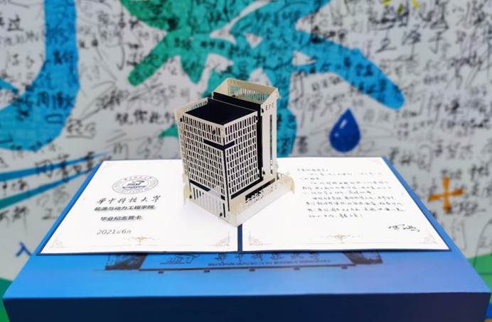 本次能源学院毕业纪念品以“蜕变”为主题,喻指学子求学路上理想信念的蜕变、知识能力的蜕变、人格担当的蜕变。纪念品包括新能源大楼3D贺卡、刻有姓名学号的戒指、华中大明信片以及文创帆布包。每份礼物都由学院精心准备和制作,耸立挺拔的新能源大楼模型,“愿你阅尽千山万水,走遍四海八荒,初心不改、青春不负!”的院长寄语,都承载着能源学院对莘莘学子的浓浓情意。奔流入海、踏梦归来,未来的路并非坦途,但相信能源学子定能在新时代的潮流中乘风破浪,在无愧国家、无愧时代、无愧人民的青春事业中砥砺奋进、久久为功!