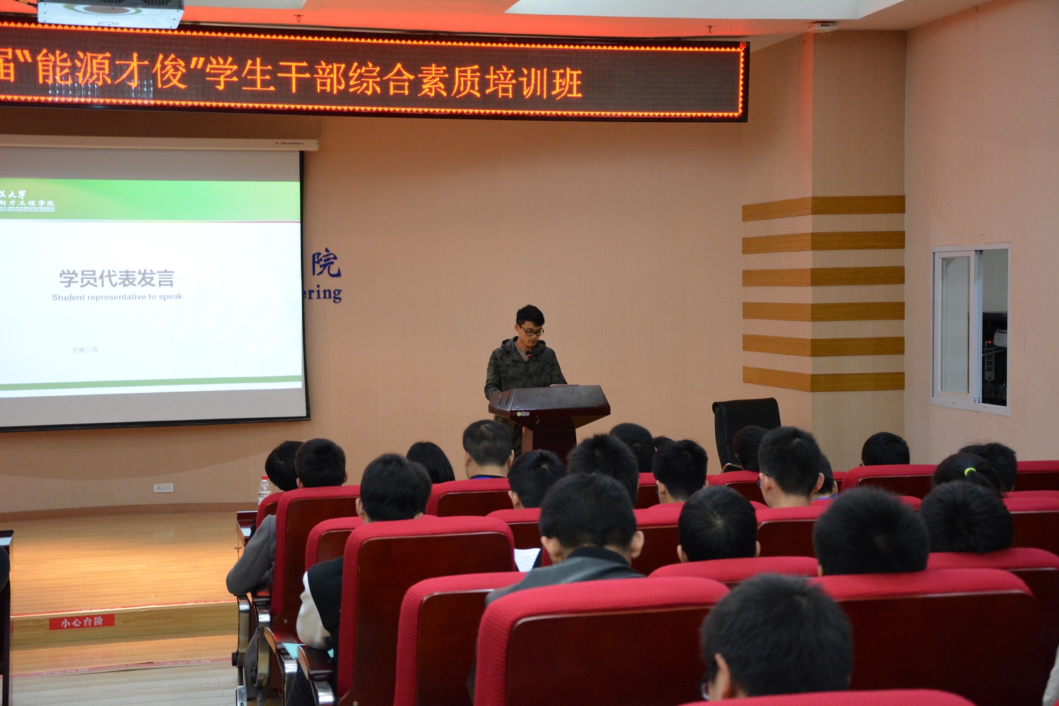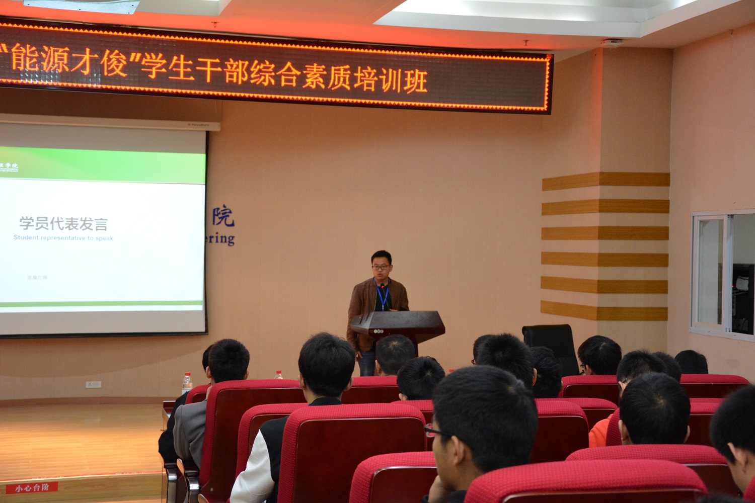 然后是本科生代表鲍国强同学发言,他表示作为一名本科学生干部很荣幸的参加此次能源才俊学生干部培训活动,他会严格遵守培训班纪律,在培训中不断提高其自身各方面的能力。希望在以后的学习生活中,在思想上做到有服务意识、奉献意识,严于律己,宽以待人;知识上有广博的知识素养;能力上善于发现问题解决问题,要有敢想敢干的精神。