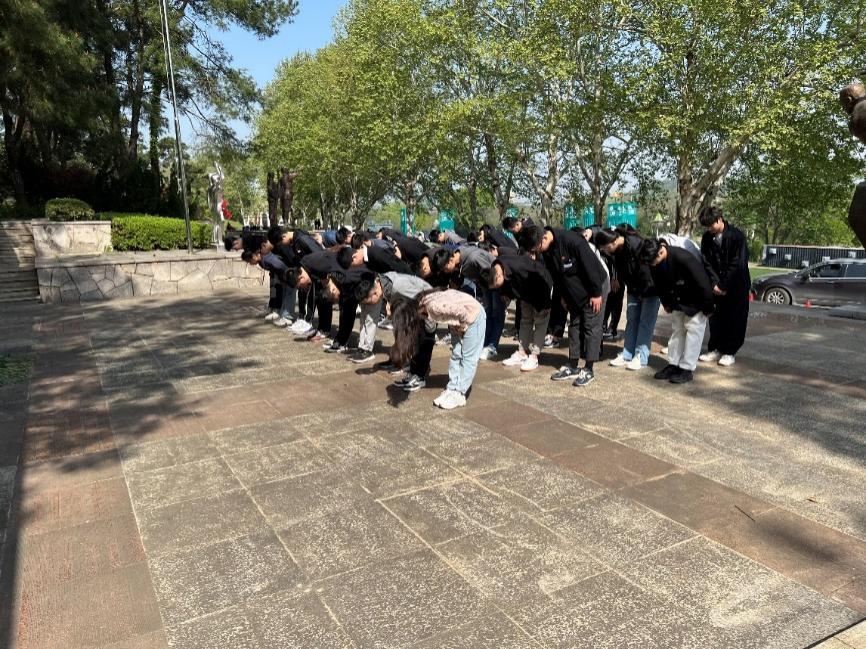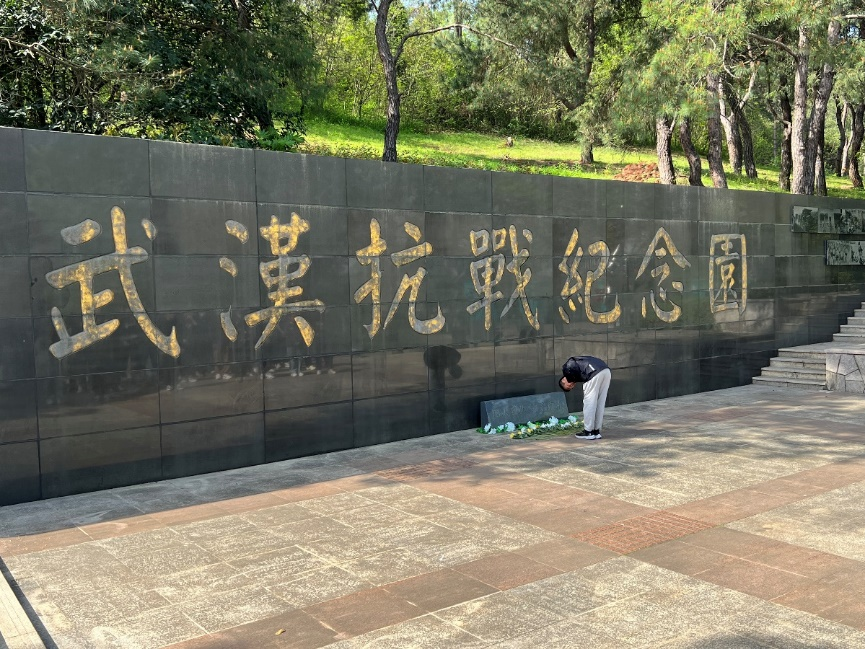 之后,同学们进入武汉抗战纪念园进行参观。武汉抗战纪念园,是2005年中国人民抗日战争暨世界反法西斯战争胜利60周年,为纪念“武汉保卫战”中牺牲的抗日先烈而修建。纪念碑上雕刻着许多关于武汉抗战历史的图画,一幕幕惊心动魄的画面透过石碑,穿越历史,与同学们建立起情感上的联结,使同学们发觉到了今天美好生活的来之不易,也感受到了红色精神引领下凝结而成的巨大力量。为了表达对伟大革命先烈们的深刻缅怀与悼念,同学们依次向烈士们献上鲜花并鞠躬致敬。