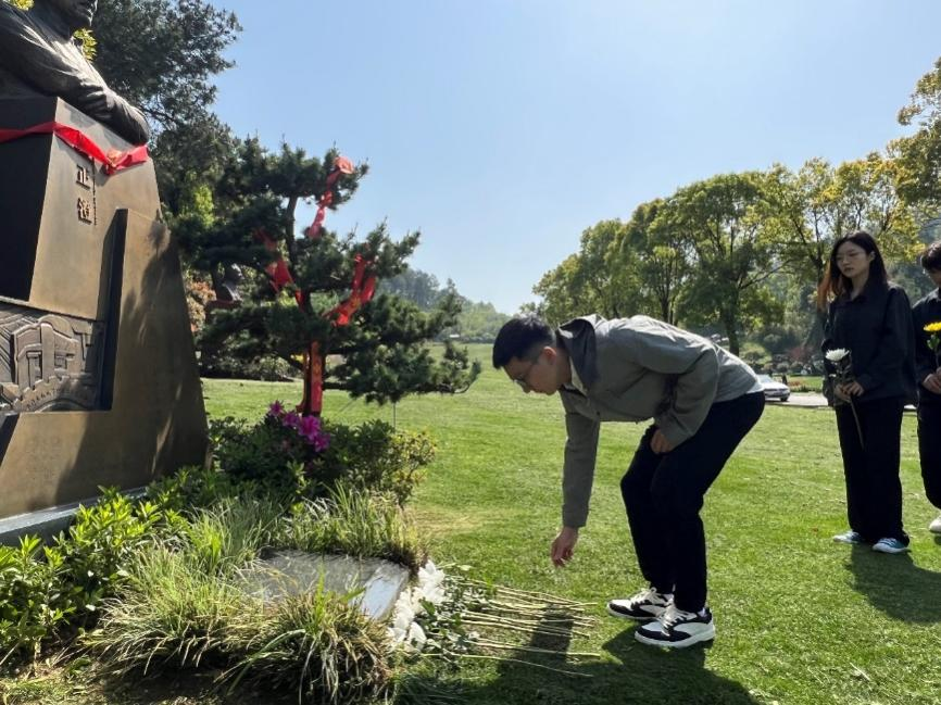 随后,跟随着红色理论宣讲团殷昊讲师的脚步,大家来到了中国共产党党员、我国著名机械工程专家、中国工程院院士,华中科技大学机械科学与工程学院教授、博士研究生导师、制造装备数字化国家工程研究中心首席科学家段正澄同志的墓碑前。殷昊讲师介绍了段正澄院士的生平事迹。段老为这座森林大学兢兢业业奋斗了几十载,见证了学校中半个多世纪的阳光雨露,当年的小树苗都已长成了参天大树。段老以其一生的不懈追求,践行着他的本色初心——扎根这块土地,繁茂这片森林,呵护这园幼苗。如今,大师已乘黄鹤去,徒留梧桐寄深情。