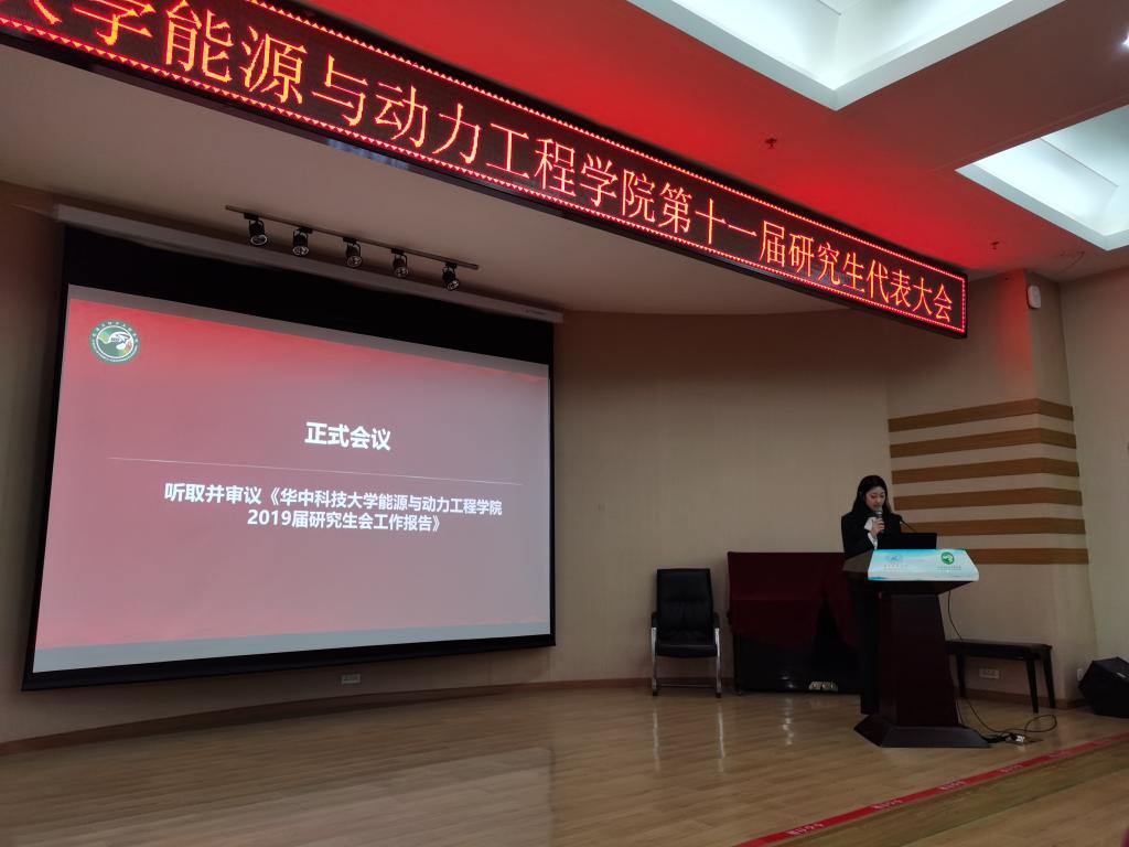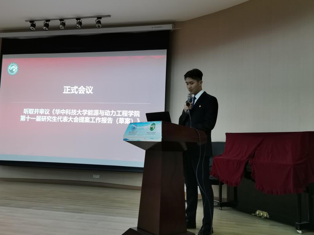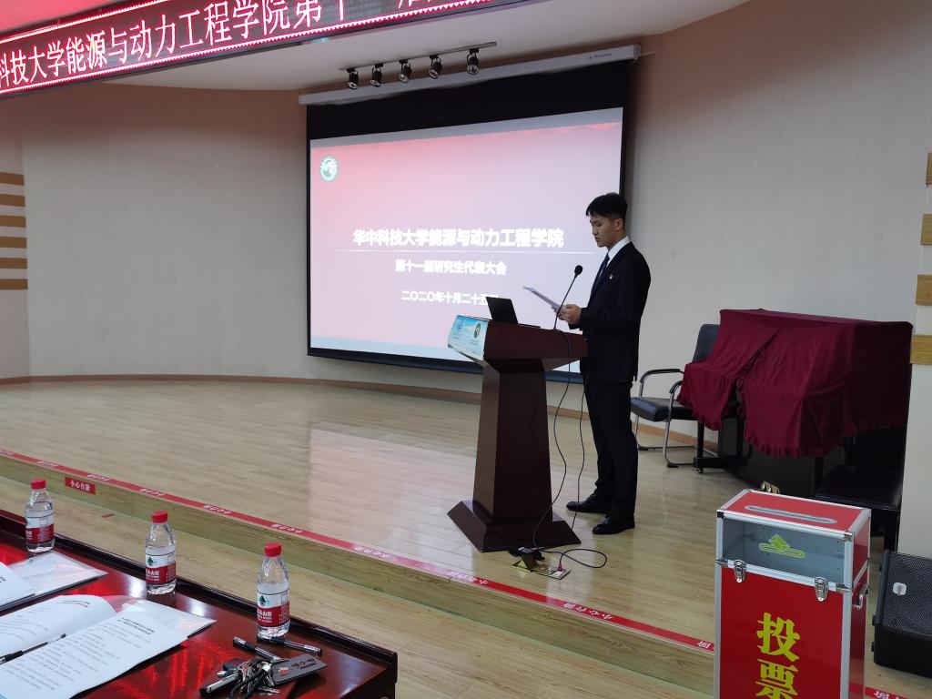 能源学院2019级研究生会执行主席秦丁益作了题为《开拓创新,锐意进取,为助力新时代卓越华中大建设,培养高水平能源人才贡献担当有为的青春力量》的研究生会工作报告。报告回顾总结了学院第十届研代会以来,研究生会工作取得的成绩和经验。研会在过去的一年为广大研究生的健康成长和全面成才搭建了广阔的平台,在加强思想引领、完善组织建设、打造品牌活动、提升权益维护等方面取得可喜成绩。未来研会将面对广大研究生在改革与实践中砥砺前行,继续完善组织架构,加强院系交流,完善服务机制温暖学子生活,与能源学子共同成长,再创辉煌。