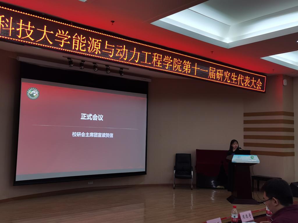 华中科技大学研究生会主席团成员周德奇代表校研究生会向大会致贺信。她充分肯定了在过去的一年里,yl23411永利集团研究生会在保障广大能源研究生日常生活权益和科研学习的同时强化组织建设,拓宽影响范围,打造极具特色的能源品牌所作出的贡献。希望在未来的日子里能源学院研究生会能与校研究生会继续紧密合作,为进一步提高研究生会的工作水平、促进研究生群体的全面发展而共同努力。