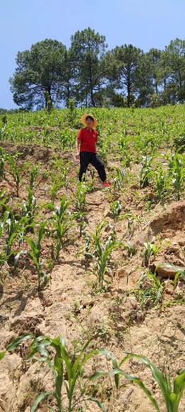 为亲身体验了农耕不易,实践队员们陪同蚂蚁堆村委会党总支字红梅书记、纪检委员罗恒明主任和石合海主任一起前往明子组和龙洞组调查退林还耕的秧苗生长情况。蚂蚁堆村地处山区,有些区域都没有通车只能步行,尤其是退林还耕点坡度很高,需要手脚并用才能爬上去,十分辛苦。罗淦同学表示:“仅仅是顶着烈日爬上山坡就几乎耗光了所有的力气,而这只是村委会干部每天工作的一部分,农民更是要在这样艰苦的条件下年复一年得种植。我虽然在农村长大却从未参与过农活,我是到了这里才明白农民的艰辛和‘粒粒皆辛苦’的真正含义。”