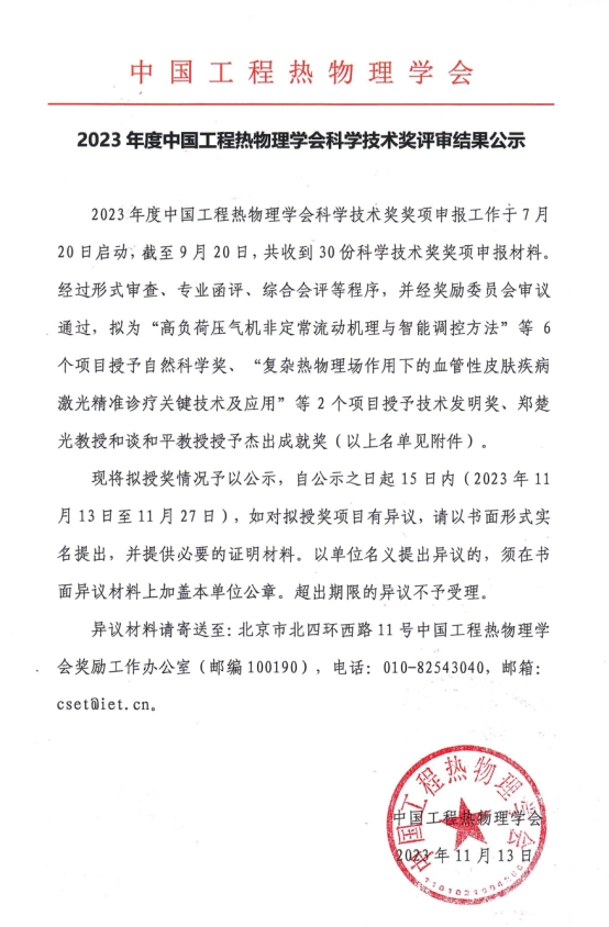 2023年度中国热物理学会科学技术奖评审结果已发布,本次评审共授予6个自然科学奖、2个技术发明奖及2个杰出成就奖,yl23411永利集团郑楚光教授在此次评审中被授予“杰出成就奖”。