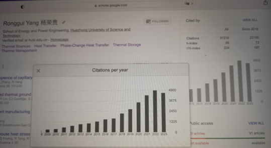 杨荣贵教授发表的文量在GoogleScholar上的引用数。