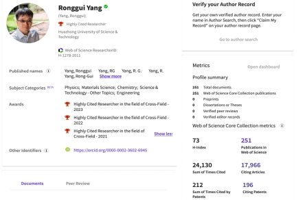 杨荣贵教授已发表了包括4篇Science、4篇NatureMaterials、3篇 Science Advances、4篇Joule、1篇Review of Modern Physics、近20篇Physics Review在内的~240篇期刊论文。Web ofScience被引频次总计24000余次,H指数为73,(Google学术总引用次数31000余次,H指数为85,2022年起年度引用次数约5000次)。杨荣贵教授已经培养了30多位博士生和博士后。其中约20位被中国科学院、上海交通大学、同济大学、华中科技大学、东南大学、吉林大学聘为教授、副教授。