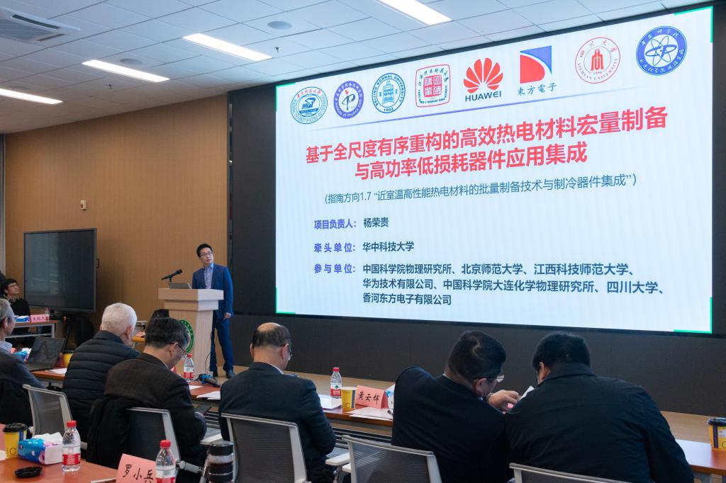会上,项目负责人杨荣贵教授首先汇报了项目目标、技术路线、主要研究内容、创新点等总体情况;然后各课题负责人中国科学院物理研究所朱航天副研究员、北京师范大学陈玲教授、江西科技师范大学徐景坤副校长、华中科技大学杨荣贵教授、华为技术有限公司邱晓东主任工程师等分别介绍了各课题的目标、关键科学问题与技术路线、研究内容等。参会专家首先对整个项目的组织进行了高度评价,尤其是有华为等企业的参与,对项目实施从应用上起到了牵引的作用;专家对项目凝练的“全尺度有序重构”、“界面热电增强”、“刚柔复合增韧”、“三低一高”等方面的创新进行了充分的肯定;认为项目提出的热电材料和微型器件国产化,并在光模块等应用中实现进口替代具有重大意义。专家组成员对整个项目的组织给予了高度评价,认为华为公司和香河东方等企业的参与,对项目实施从应用上起到了牵引的作用,肯定了该项目对解决我国高端热电材料与器件面临“卡脖子”风险的战略意义。对具体实施方案的新颖性和可行性开展了问询与讨论,并针对项目的指标、研究规划、进度安排、考核方式等方面提出了建设性意见。3月21日,项目负责人杨荣贵教授与各课题负责人、课题骨干细致梳理了专家组的意见建议,并对下一步研究重点进行了部署。