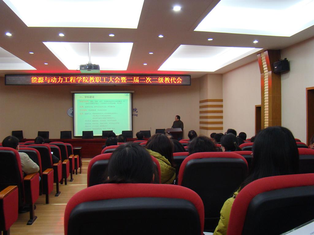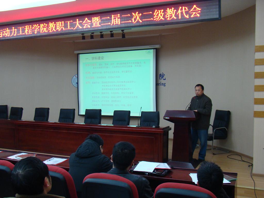 2011年12月29日下午,能源学院教职工大会暨二届二次二级教代会在动力楼402教室隆重召开;学院领导、各教研室教师以及学院机关职工近百人出席会议;院工会主席张立麒主持会议。
