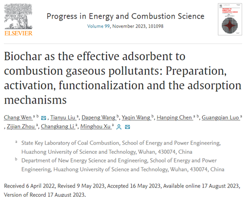 本站讯(通讯员温昶)2023年8月,能源领域国际顶级期刊《Progress in Energy and Combustion Science》(IF=29.5)在线刊发了徐明厚教授团队题为“Biochar as the effective adsorbent to combustion gaseous pollutants: Preparation, activation, functionalization and the adsorption mechanisms”的综述论文(2023, 99, 101098)。能源学院温昶副教授为第一作者,徐明厚教授为论文通讯作者,陈汉平教授、罗光前研究员以及周子健副教授为论文共同作者。本论文是yl23411永利集团为第一单位在《Progress in Energy and Combustion Science》期刊上发表的第四篇论文。