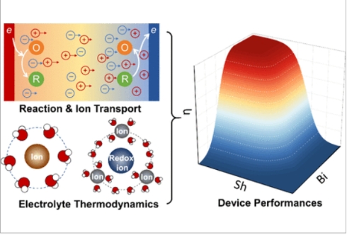 近年来,以离子作为电荷和能量载流子的离子热电材料(i-TE)与器件引起了广泛兴趣,因其具有高达若干至上百mV/K的超高热电势,为回收低品位热能提供了新的技术路径。然而,目前研究热电普遍集中于进一步提高热电势,而忽略了非平衡态下离子输运、电化学反应动力学对器件效率的影响。团队率先在研究中阐明了影响i-TE器件效率的非平衡热力学机理,分析了传热、离子输运、反应势垒等因素对效率的影响规律,并从熵的角度总结并且分析了现有文献中提升离子热电器件功率与效率的可行方法。同时,在最新研究进展中进一步提出,不同于半导体热电材料,离子热电器件无法仅基于材料性质定义热电优值(ZT);团队通过对离子输运、电化学反应、传热的耦合分析,严格推导出了热离子电容与热化电池等离子热电器件的正确热电优值定义,并准确描述离子热电中传热、传质、电化学反应对器件效率的协同影响。相关论文发表于《ACS能源快报》(ACS Energy Letters).