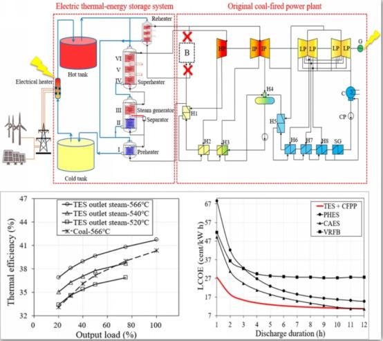 目前,煤电仍是我国的主要电力来源,随着“双碳”目标的推进,煤电将逐渐从基础性负荷电源转变为调节性电源,耦合热储能是实现煤电灵活性改造的重要方法。为解决新型电力系统的稳定性问题以及提高煤电的灵活性,研究团队提出一种采用熔盐储能与火电厂耦合的电网储能方法,电-热-电转化往返效率可以达到42%,与抽水蓄能相当。基于储能的火电厂比传统电厂具有更高的热效率,在释能时长<10h时,与抽水蓄能、压缩空气储能、液流电池相比,具有更低的度电成本。