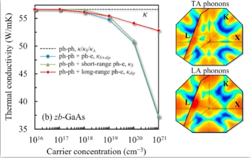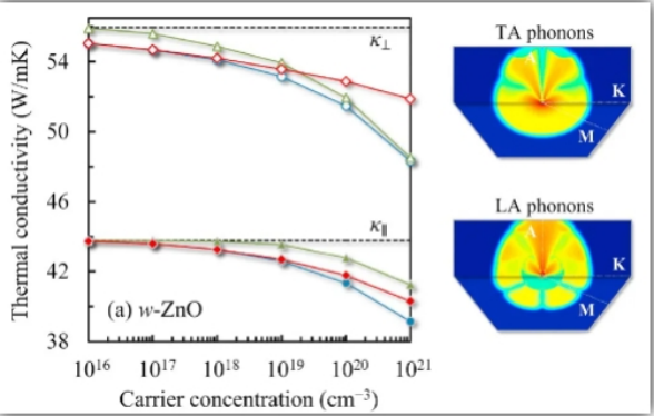 团队开发了全第一性求解电子-声子耦合输运于相互作用的计算软件,能够从载流子层面对热、电耦合输运散射机理进行理论预测,深入研究宽带隙半导体、热电材料、压电及热释电材料的能量转换机理,为性能优化调控提供理论基础。例如,团队通过对高温相硒化亚锡的电子及声子散射作了系统性的研究,阐明了电子的谷间散射在n型硒化亚锡中电学输运的重要性,提出了利用纳米工程将硒化亚锡晶粒限缩在10纳米左右,能够有效的提高提热电优值。团队进一步研究了压电半导体中,由于电偶矩导致的长程电声耦合作用对热导率的影响。团队提出了关于压电及弗勒里希耦合引起的声子散射率的解析公式。我们发现在六方氧化锌中,由于晶体中心对称性缺失的声子占多数,因此电声耦合对其热输运的影响较大。相关论文发表于Materials Today Physics。