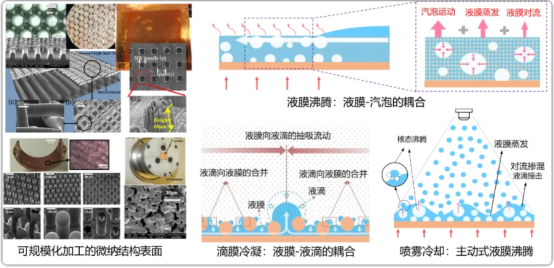 当前电子、光电与电力系统热流密度节节攀升,如GaN芯片热点的热流密度达到10kW/cm2的量级,传统的风冷和液体单相强迫对流难以满足高热流散热需求;汽液相变由于利用了流体的相变潜热,具有极高的冷却能力,适用于电子、光电与电力系统的高热流热管理。团队聚焦于发展可规模化制备的微纳结构表面,如利用微尺度3D打印、电镀、热扩散键合、磁控溅射镀膜、光刻、化学刻蚀等制备工艺,成功地开发了一系列微纳米结构功能表面,并用于增强汽液相变换热(蒸发/沸腾、冷凝、喷雾冷却等);探索相变中汽-液动力学、换热机理强化的新原理和新机制。如结合池沸腾与液膜蒸发的换热优势,利用液膜-汽泡耦合调控,提出液膜沸腾高效散热的新策略;综合膜状冷凝和滴状冷凝的换热优点,耦合液膜-液滴输运,实现滴膜冷凝强化新机制;通过增强液膜沸腾占比的新视角,大幅提高喷雾冷却的换热系数和临界热流密度,突破了传统冷却技术的散热极限。